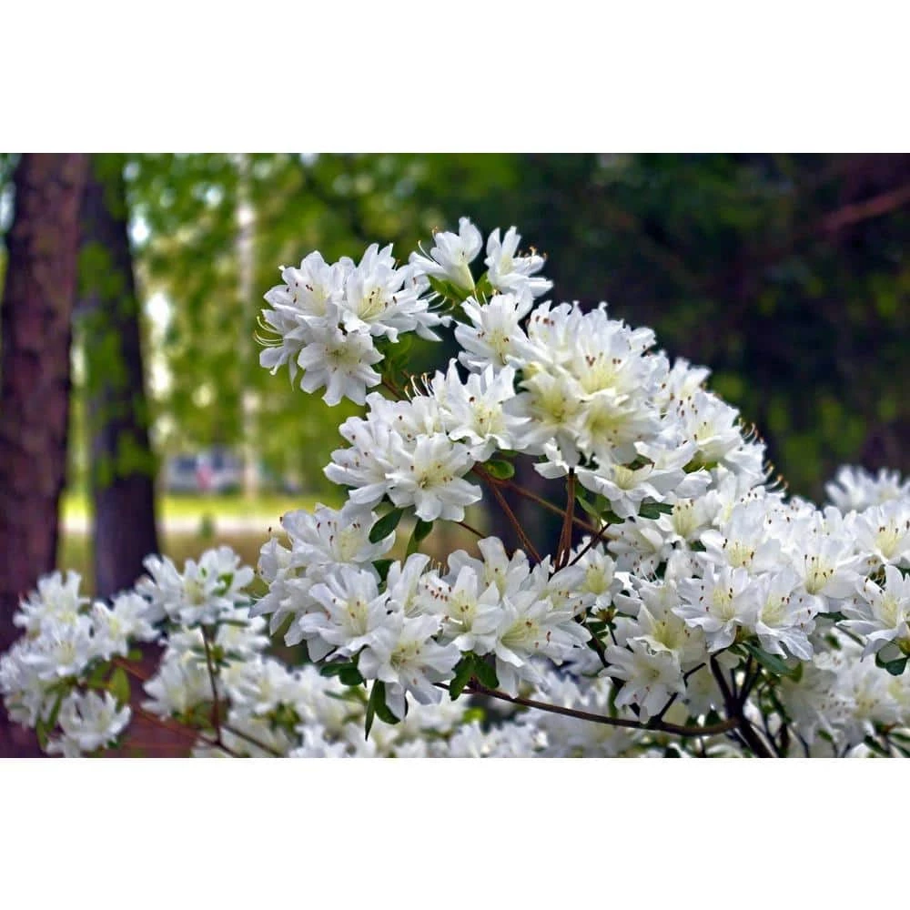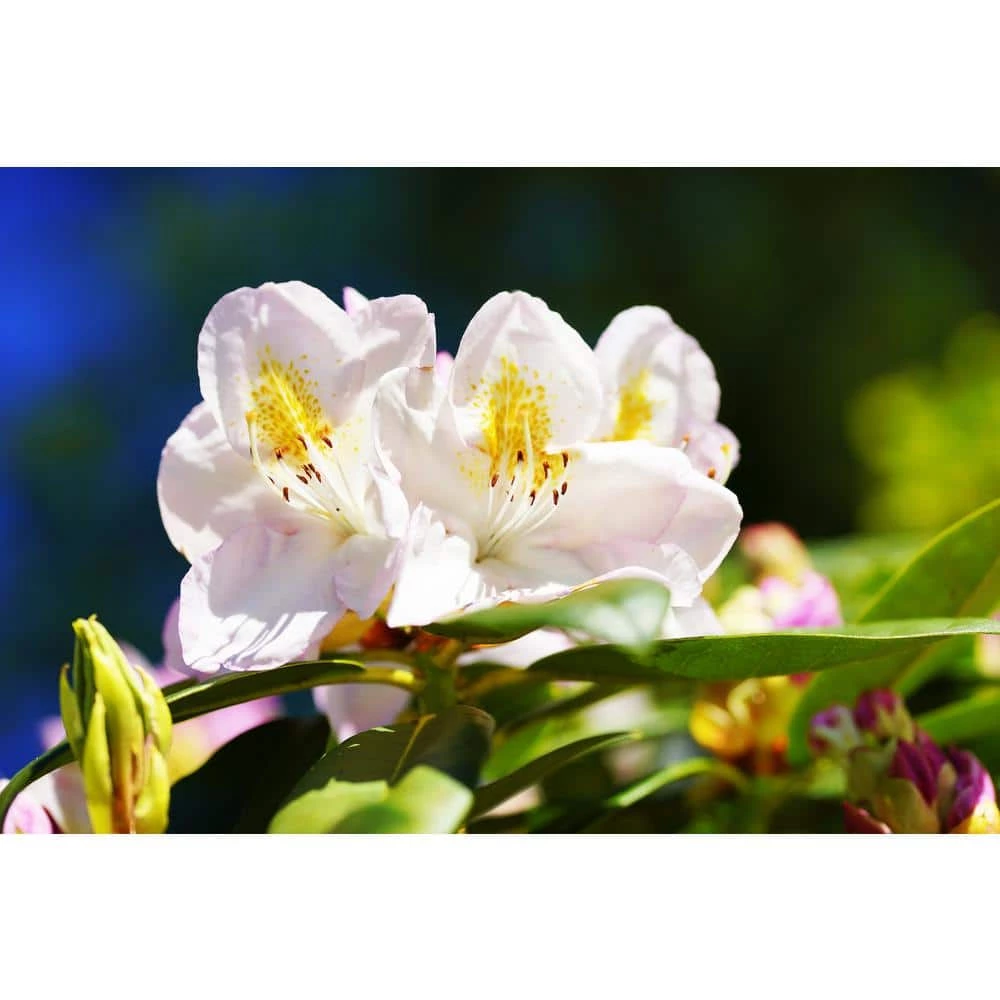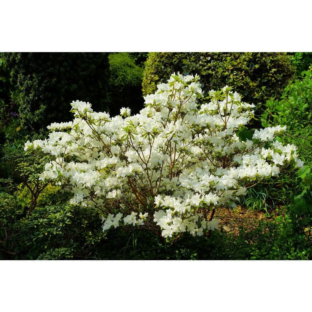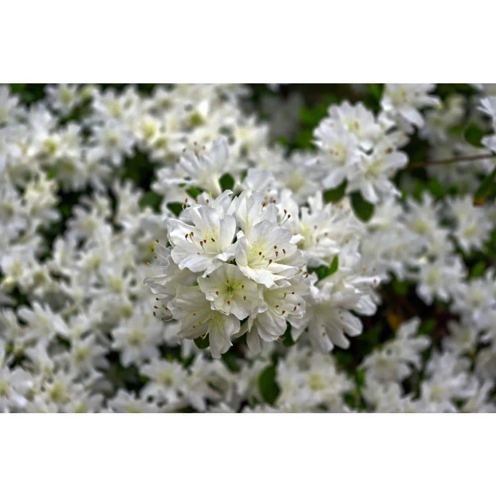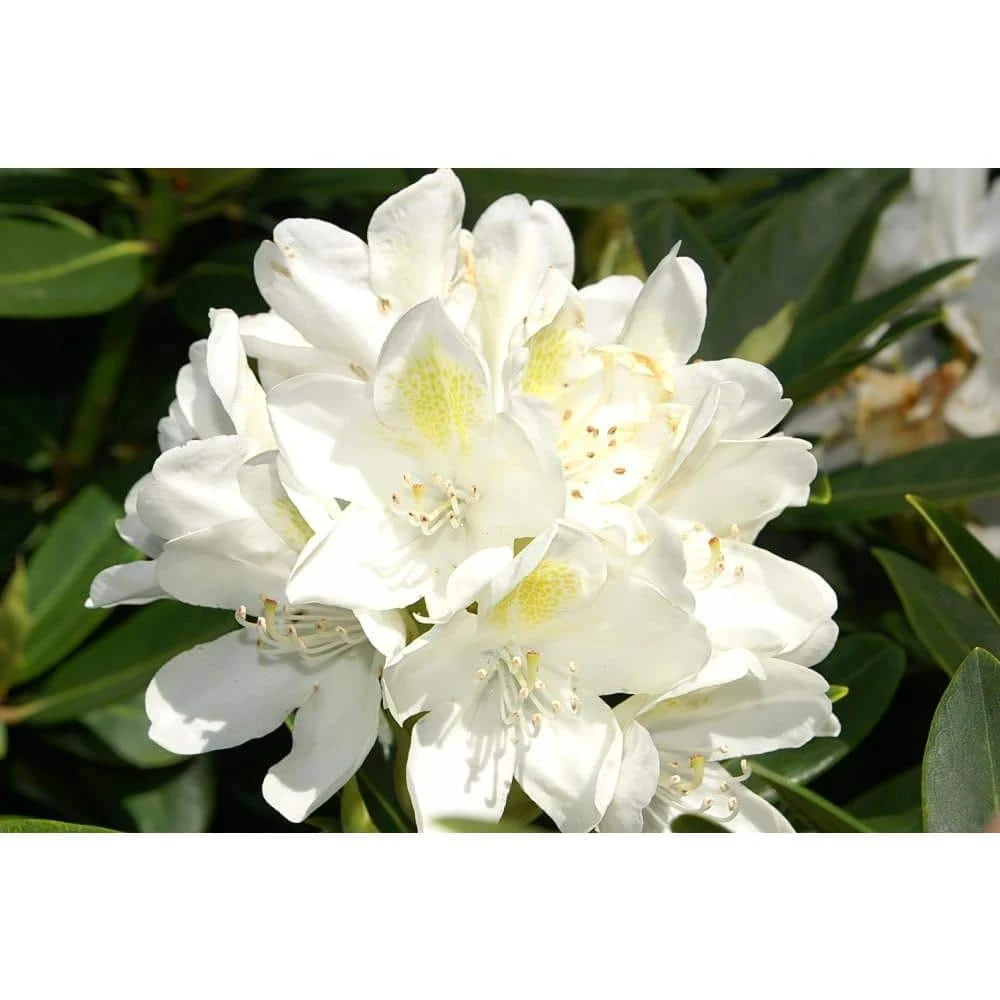 The Chionids Rhododendron sports showy snow-white blossoms which are marked by a distinctive golden sunburst contained within the throat of each flower, providing a welcomed contrasting element. At the base of the blooms you will find lush green foliage that serves to draw attention to the pure white coloring of the blooms even further. The plant grows rather slowly, but in a very even and symmetrical fashion, without any offsetting protrusions. For every bud growing on a Chionids Rhododendron, a dozen pure white flowers bloom in perfect unison. Although this Rhododendron shows its best colors in spring, the soft evergreen foliage adds color and texture year-round. Chionids grows well in USDA zones 5-9 and thrives in partial sunlight or shade. Chionids is perfect for planting en masse along borders and will reach a height between of 4 ft. and 5 ft. with an equal spread.