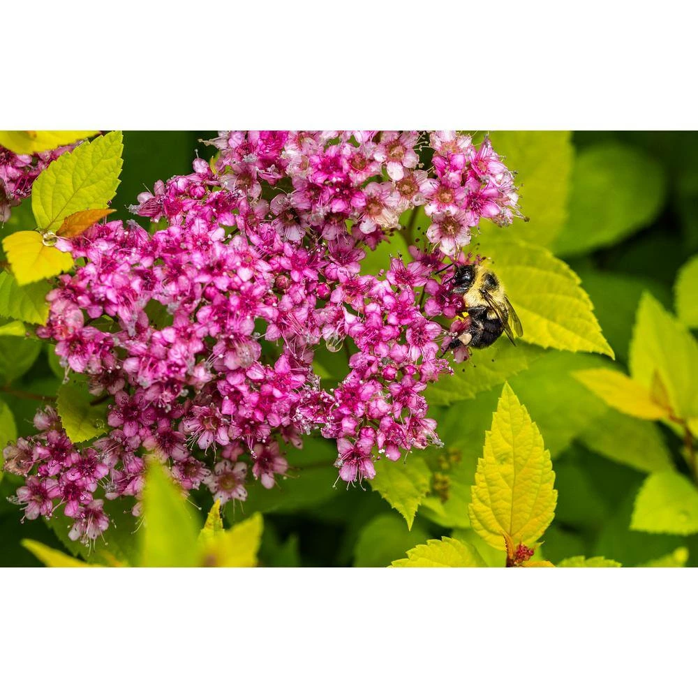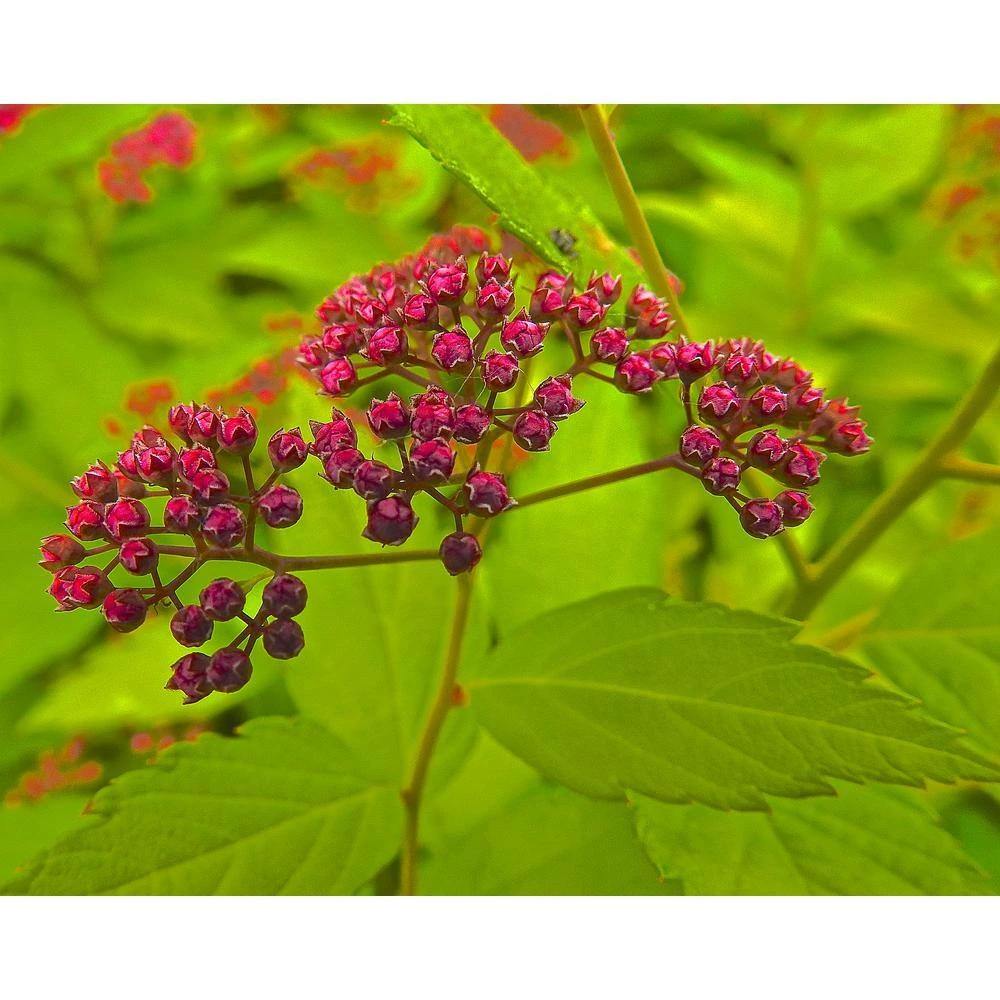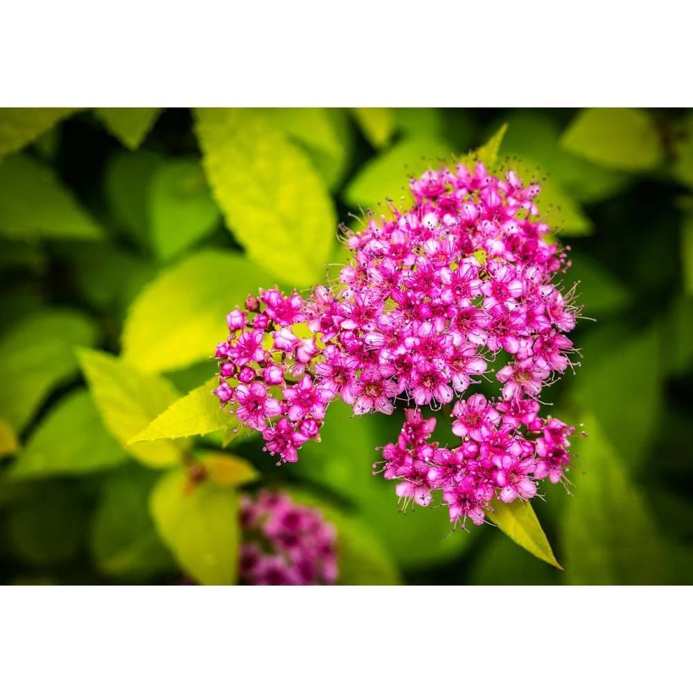 Gold flame boasts attractive bunches of pink flowers that literally sparkle in the sunlight due to their long crystal covered filaments. This dazzling effect plays a huge role into why Spires have become so popular over the years, among a whole host of other beneficial qualities. What truly sets Gold flame apart from other sparkling Spires however, is its exceptionally bright neon-yellow foliage. These colorful leaves play 2 important roles. Firstly, the yellow coloring provides a sharply contrasting backdrop against the lovely pink flower clusters which serves to highlight both beautiful colors. Secondly, the neon-yellow foliage continuously adds bright color to landscapes in between periodic blossoming of the flowers. An abundance of rose-pink miniature flowers bloom within inflorescences, which refers to a tight cluster of many small flowers blooming together in unison. Flower bunches blossom all the way around the ever-changing foliage of this compact shrub. Spirea are among the hardiest of all compact flowering shrubs cultivated today and Gold flame is no exception, tolerating temperatures below even minus 25°F. This Spirea will grow between 2 ft. to 3 ft. in height and 3 ft. to 4 ft. in width at maturity. Flourishes in both shade and sun.