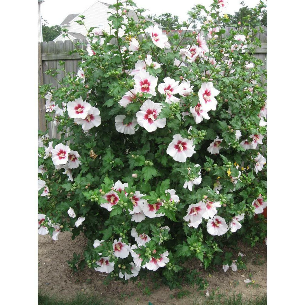 The Red Heart Rose of Sharon is a wholly unique and colorful Hibiscus shrub with that lends an unusually exotic appeal to landscapes. Another rare summer-blooming hibiscus, Red Heart flowers typically open in Mid-July to reveal huge saucer-shaped flowers measuring 3 in. to 5 in. across. The soft white petals sharply contrast to a ruby-red splash in the heart of the flower, thus bringing about its unique name. Highly fragrant blossoms attract butterflies and hummingbirds to their sweet scent, plentiful nectar and pollen. Even as a young plant Red Heart puts on numerous fragrant blossoms that naturally grow in an evenly spaced and symmetrical fashion across its branches. Red Heart is often labeled as everblooming since the flowers bloom for months at a time, from July until the first frosts occur. Red Heart Rose of Sharon reaches heights of 5 ft. to 8 ft. with a spread of 6 ft. at maturity, but can of course be kept at any size smaller with regular pruning. Red Heart is an excellent accent plant that brings depth and color when most flowers have finished for the season. This hardy shrub is highly deer-resistant, heat and drought tolerant, cold-hardy down to minus 15°F, as well as tolerant of high humidity. Exotic, large, colorful ruby-red and white everblooming flowers bloom for months at a time, while the plant itself is among the hardiest and most pest-resistant. This is a perfect addition to any landscape in almost any climate.