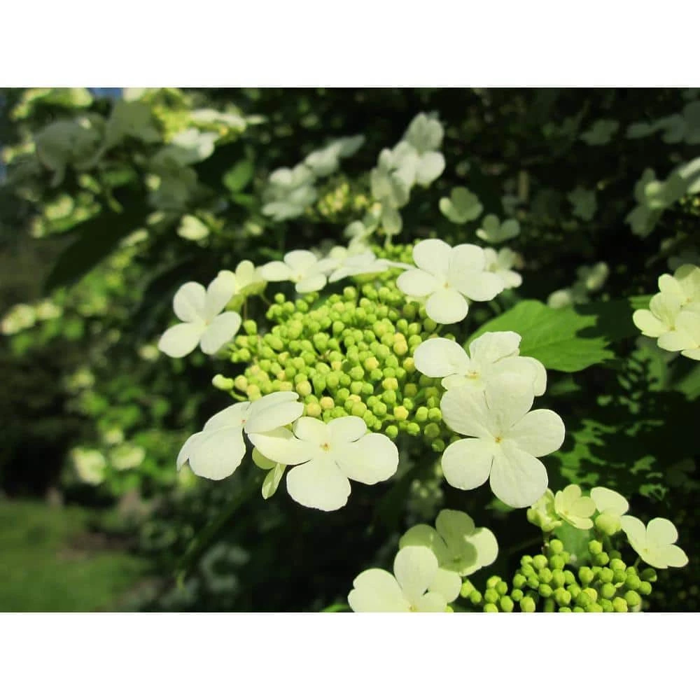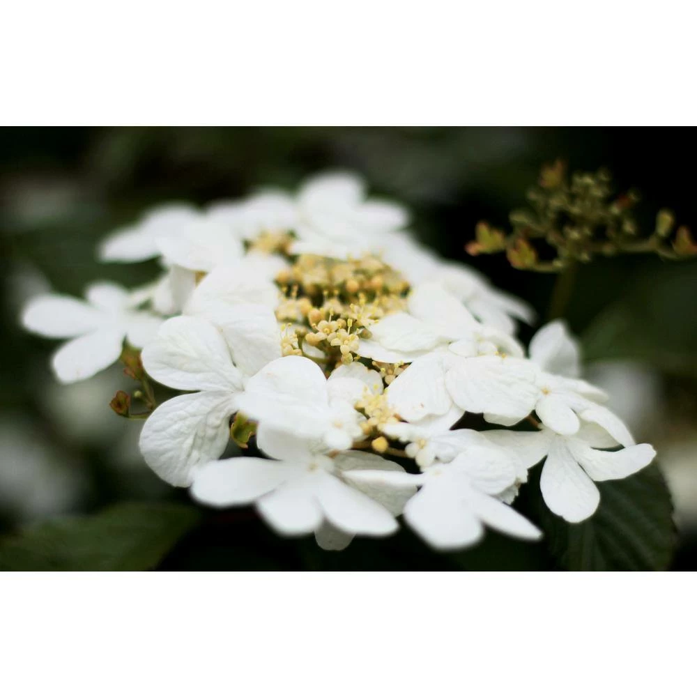 The aptly-named Summer Snowflake Viburnum puts on a magnificently unique display of snow-white halo blossoms that begin inspiring and end in early fall with the changing colors of its foliage. The limbs of a Summer Snowflake tend to grow further outwards in a horizontal fashion, creating a beautiful tiered wedding cake effect. These pure-white flowers naturally grow in large round clusters. When they finally begin to open in mid-to-late spring, only the outer buds bloom at first, creating the signature halo blossom display. Given a little time, the inner buds start to flush and open as well, changing the blossoming shape from that of a halo to a beautiful winter snowflake in the middle of summer. Blossoming continues into early fall, simultaneously occurring with the changing foliage colors that gradually turn from deep green to a striking dark burgundy/purplish-red shade. Summer Snowflake Viburnum is 1 of the few ornamental plants which turn to lovely shades of autumn color while still blooming at the same time. This beautifully unique Viburnum reaches between 5 ft. and 8 ft. in height, with an equal horizontal spread. This shrub loves shade and sun both and grows just about anywhere with constant watering through at least the first summer after planting. Once established, Summer Snowflake is a wonderfully low-maintenance shrub that offers brilliant pure white halo/snowflake-shaped blossoms as well as a naturally tiered wedding cake branching form.