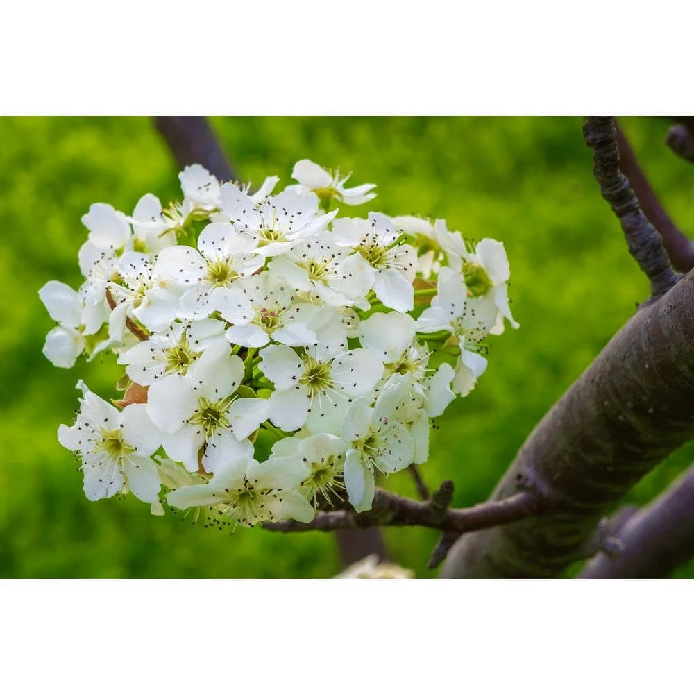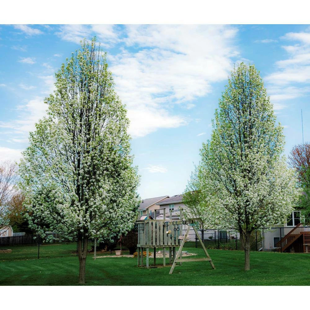 Redspire has a tight, upright growth habit that makes it easy to add fast, colorful life to your landscape. The snowy white flowers blanket this tree in mid-spring, creating a dramatic effect against shiny, green-maroon leaves. These narrow leaves are at their full peak of color in autumn however when they go through a veritable light show of gold, purple and crimson. This Flowering Pear cultivar is typically planted for its flowers, but becomes beloved for its vivid shades of autumn color. Another attractive feature of Redspire is the deep-reaching root structure leaves it especially well-suited for planting near sidewalks, roads and other paved areas since the taproots tend to grow straight down, leaving surfaces undisturbed over time. This structure also allows Redspire to require notably less watering as the roots pull moisture from deeper in the ground than other trees. Redspire Flowering Pear, botanical name Pyrus calleryana Redspire, is suited to USDA zones 5-9, with full sun to part shade. It is quite tall and narrow at maturity, reaching 35 ft. to 45 ft. tall and 15 ft. to 20 ft. W. The Redspire Flowering Pear is a fast-growing, drought-tolerant ornamental tree that provides multi-seasonal interest beginning with large snow-white blossoms in spring and ending with a dynamic and colorful autumn display.