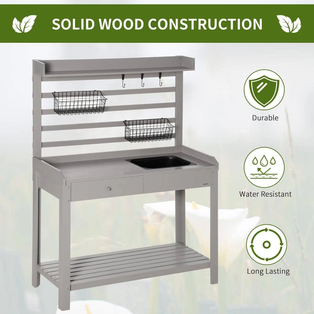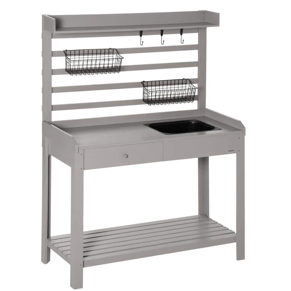 This potting bench from Outsunny has especially outstanding functionality to bring an excellent addition to your garden. Made with solid wood, the potting tables looks natural in any outdoor setting. A dry sink is equipped to be used as a water sink to wash or meet your basic gardening needs. This outdoor storage bench’s additional hooks and hanging baskets provide ample storage space. Check out this practical potting bench and add convenience to your life outside.