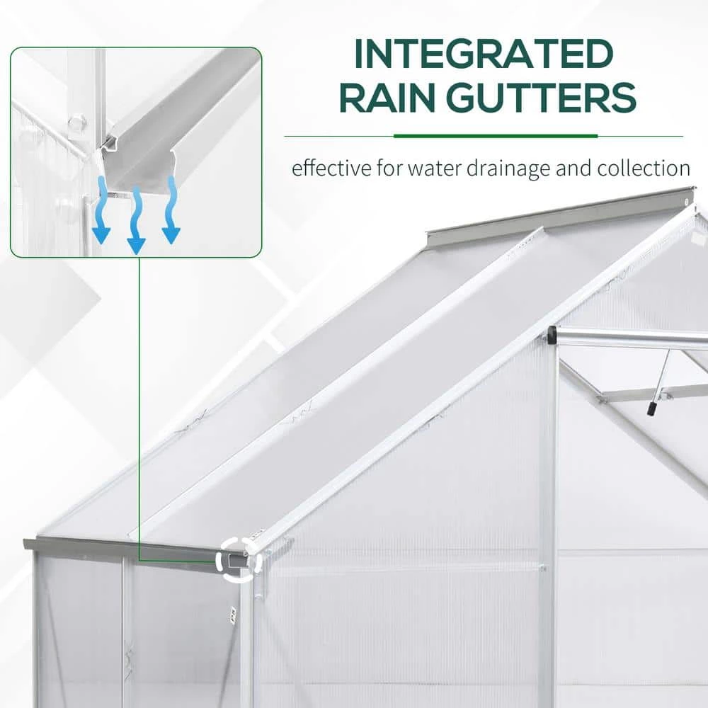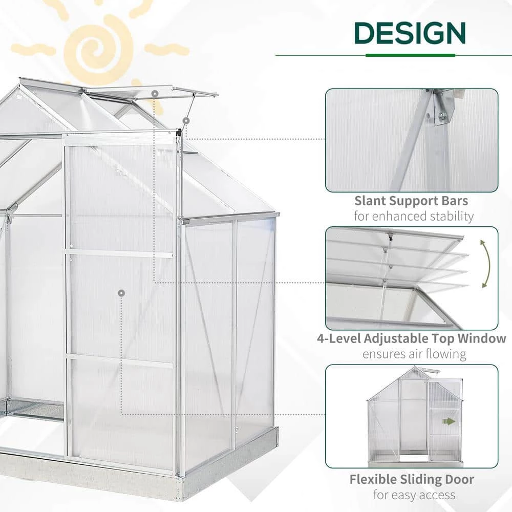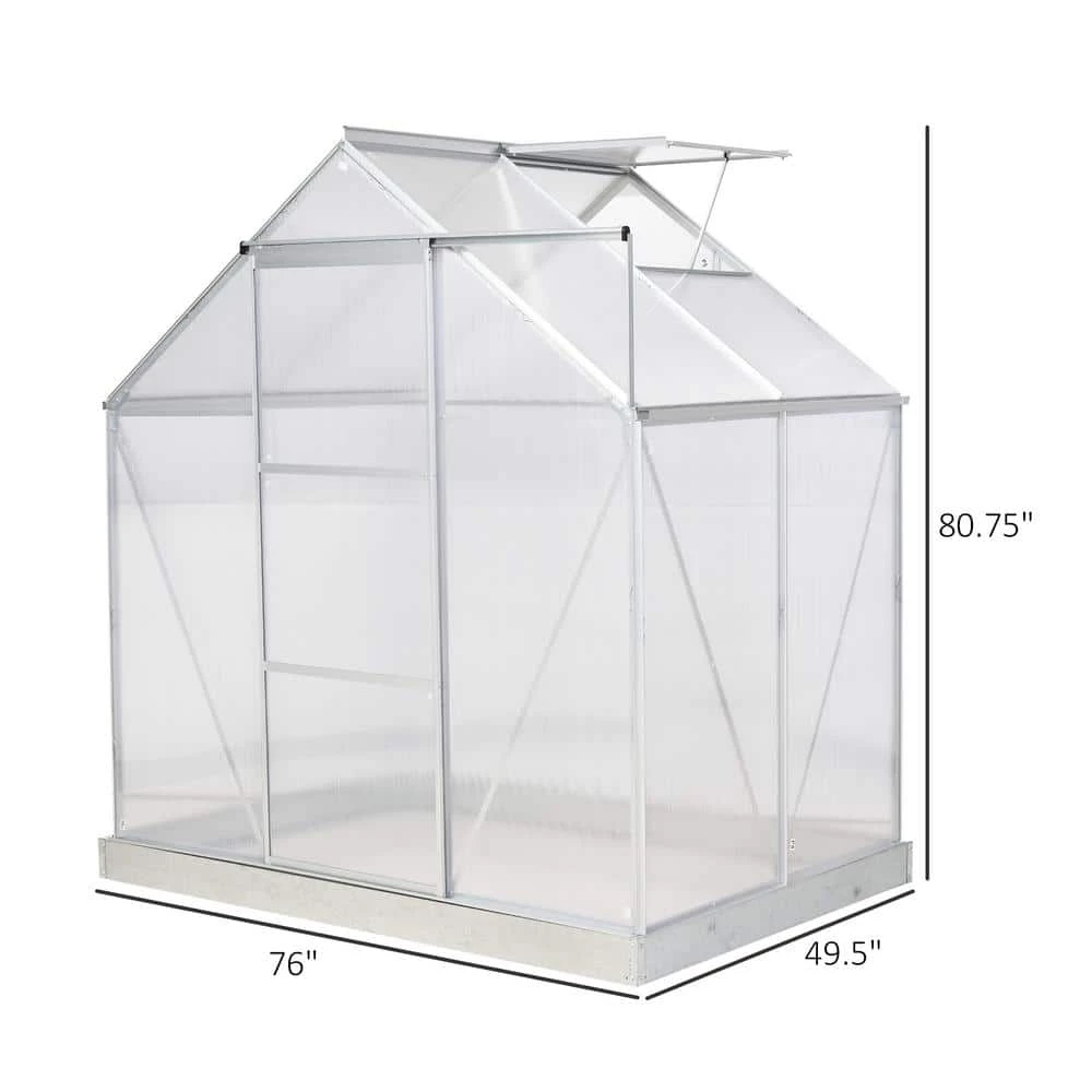 Let your plants grow heartily with this outdoor greenhouse from Outsunny. Inner area provides plenty of growing room, with an aluminium frame keeping the structure upright and in place, surrounded with durable polycarbonate panels, which protects from rain and harsh sunlight. A sliding front door provides easy access, with a small window for ventilation inside when needed. Galvanised steel base for extra-strength.
