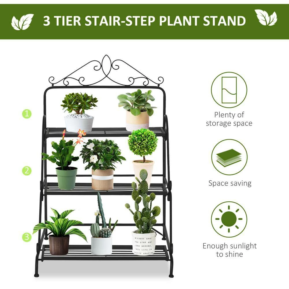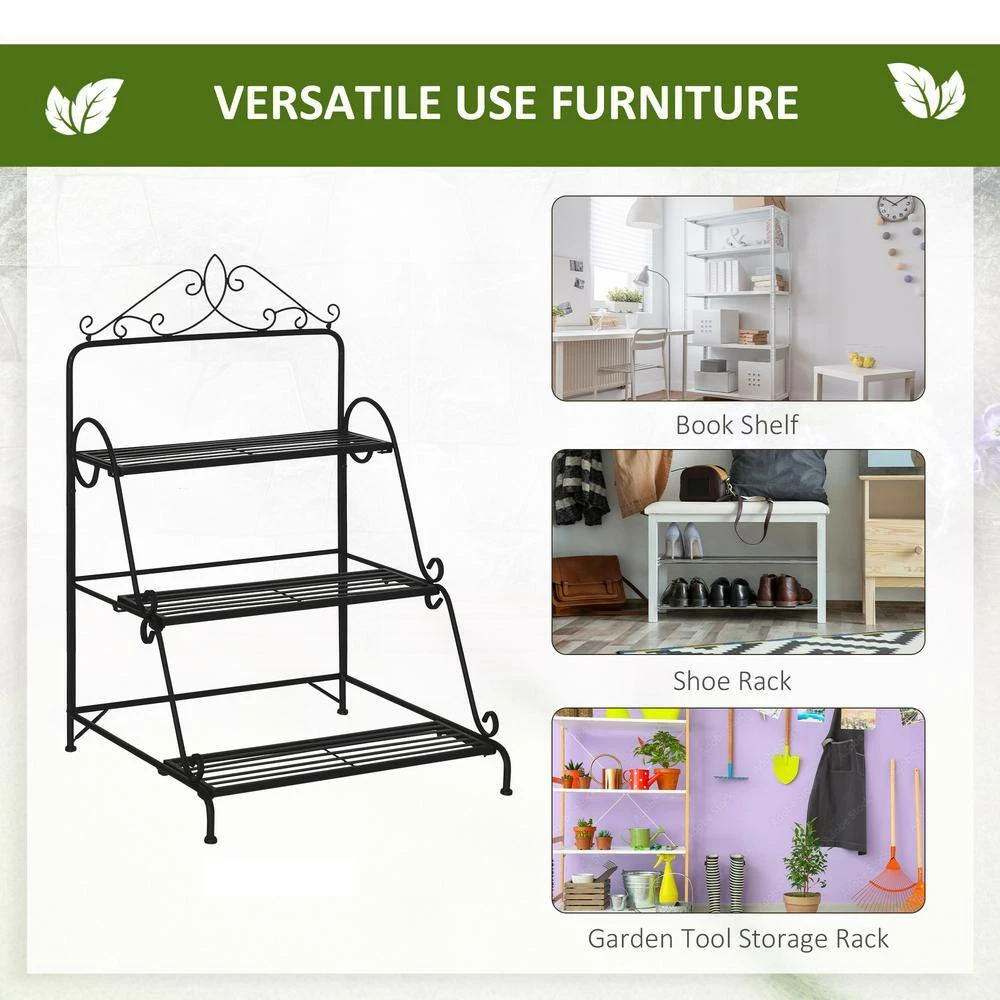 Add style and storage to your home with this charming flower display stand rack from Outsunny. Our 3-tiered flower rack is built with a gorgeous sturdy metal scrollwork frame, which brings a touch of elegance to your porch, patio, indoor space, or wherever you want to utilize it. It is perfect for holding everything from plants to books to decorative candles. With this smart plant pot stand, you can easily keep your surrounding area neat, tidy, and stylish.